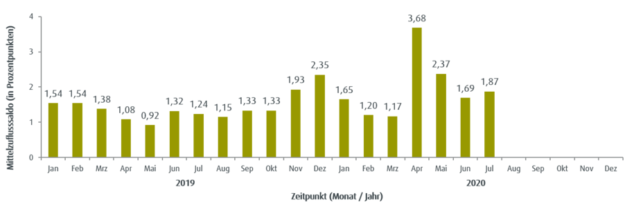 Veränderungen der Mittelzuflüsse und Mittelabflüsse werden über den Fundflow-Faktor ausgedrückt. Dabei werden die monatlichen Mittelzuflüsse des Berichtszeitraums in Relation zu den monatlichen Mittelabflüssen gesetzt. Bei einem Fundflow-Faktor über eins überwiegen die Mittelzuflüsse, bei einem Fundflow-Faktor unter eins die Mittelabflüsse.