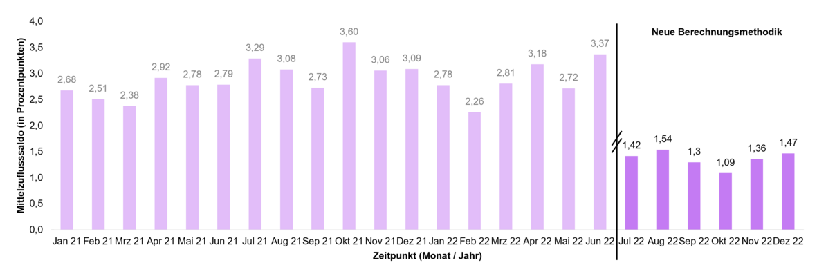 Veränderungen der Mittelzuflüsse und Mittelabflüsse werden über den Fundflow-Faktor ausgedrückt. Dabei werden die monatlichen Mittelzuflüsse des Berichtszeitraums in Relation zu den monatlichen Mittelabflüssen gesetzt. Bei einem Fundflow-Faktor über eins überwiegen die Mittelzuflüsse, bei einem Fundflow-Faktor unter eins die Mittelabflüsse.