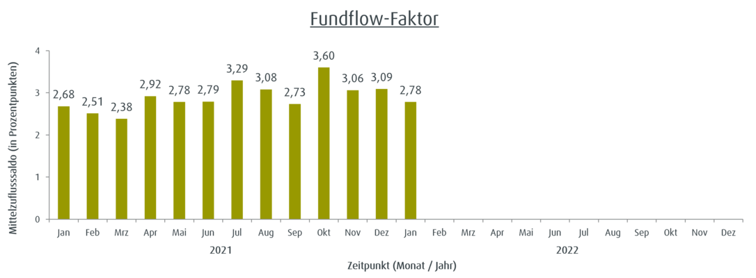 Veränderungen der Mittelzuflüsse und Mittelabflüsse werden über den Fundflow-Faktor ausgedrückt. Dabei werden die monatlichen Mittelzuflüsse des Berichtszeitraums in Relation zu den monatlichen Mittelabflüssen gesetzt. Bei einem Fundflow-Faktor über eins überwiegen die Mittelzuflüsse, bei einem Fundflow-Faktor unter eins die Mittelabflüsse.