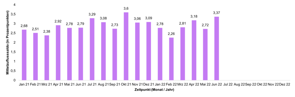 Veränderungen der Mittelzuflüsse und Mittelabflüsse werden über den Fundflow-Faktor ausgedrückt. Dabei werden die monatlichen Mittelzuflüsse des Berichtszeitraums in Relation zu den monatlichen Mittelabflüssen gesetzt. Bei einem Fundflow-Faktor über eins überwiegen die Mittelzuflüsse, bei einem Fundflow-Faktor unter eins die Mittelabflüsse.