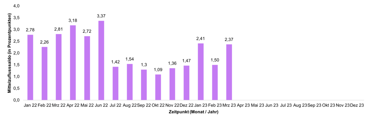 Veränderungen der Mittelzuflüsse und Mittelabflüsse werden über den Fundflow-Faktor ausgedrückt. Dabei werden die monatlichen Mittelzuflüsse des Berichtszeitraums in Relation zu den monatlichen Mittelabflüssen gesetzt. Bei einem Fundflow-Faktor über eins überwiegen die Mittelzuflüsse, bei einem Fundflow-Faktor unter eins die Mittelabflüsse.