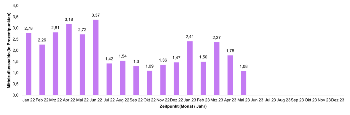 Veränderungen der Mittelzuflüsse und Mittelabflüsse werden über den Fundflow-Faktor ausgedrückt. Dabei werden die monatlichen Mittelzuflüsse des Berichtszeitraums in Relation zu den monatlichen Mittelabflüssen gesetzt. Bei einem Fundflow-Faktor über eins überwiegen die Mittelzuflüsse, bei einem Fundflow-Faktor unter eins die Mittelabflüsse.