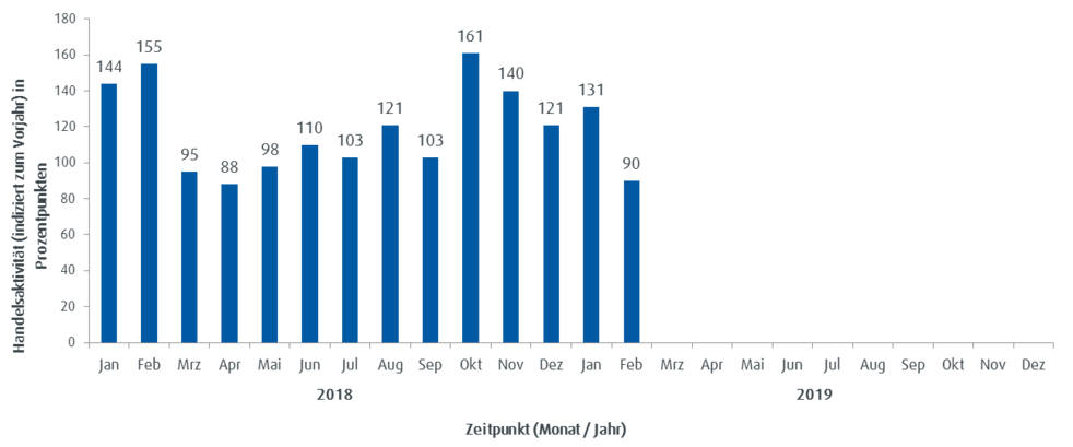 Die Handelsaktivität basiert auf dem Handelsvolumen und lässt unmittelbare Rückschlüsse auf den aktuellen Jahrestrend im Handel mit ETFs bei ebase Kunden zu. Ein Wert von über 100 steht für eine überdurchschnittliche Handelsaktivität der Kunden im Vergleich zum mittleren monatlichen Handelsvolumen des Vorjahres; ein Stand unter 100 zeigt eine unterdurchschnittliche Handelsaktivität an.