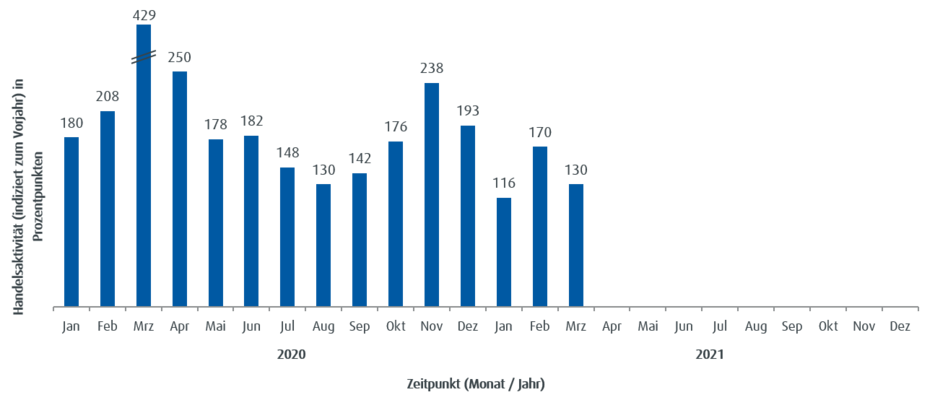Die Handelsaktivität basiert auf dem Handelsvolumen und lässt unmittelbare Rückschlüsse auf den aktuellen Jahrestrend im Handel mit ETFs bei ebase Kunden zu. Ein Wert von über 100 steht für eine überdurchschnittliche Handelsaktivität der Kunden im Vergleich zum mittleren monatlichen Handelsvolumen des Vorjahres; ein Stand unter 100 zeigt eine unterdurchschnittliche Handelsaktivität an.