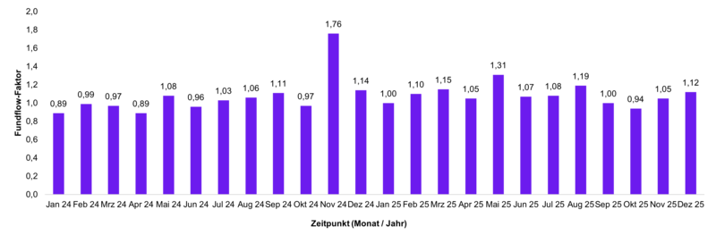 Veränderungen der Mittelzuflüsse und Mittelabflüsse werden über den Fundflow-Faktor ausgedrückt. Dabei werden die monatlichen Mittelzuflüsse des Berichtszeitraums in Relation zu den monatlichen Mittelabflüssen gesetzt. Bei einem Fundflow-Faktor über eins überwiegen die Mittelzuflüsse, bei einem Fundflow-Faktor unter eins die Mittelabflüsse.