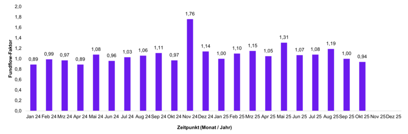 Veränderungen der Mittelzuflüsse und Mittelabflüsse werden über den Fundflow-Faktor ausgedrückt. Dabei werden die monatlichen Mittelzuflüsse des Berichtszeitraums in Relation zu den monatlichen Mittelabflüssen gesetzt. Bei einem Fundflow-Faktor über eins überwiegen die Mittelzuflüsse, bei einem Fundflow-Faktor unter eins die Mittelabflüsse.