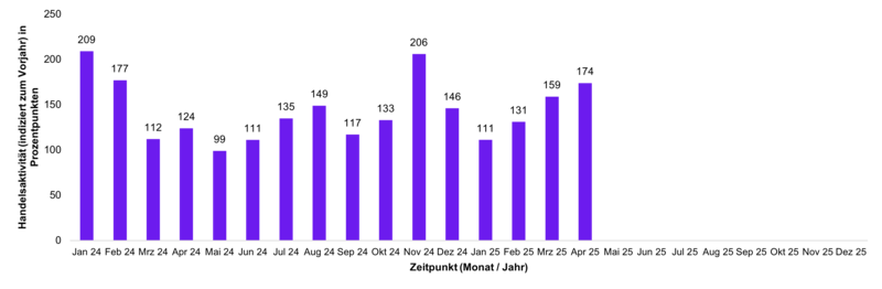 Die Handelsaktivität basiert auf dem Handelsvolumen und lässt unmittelbare Rückschlüsse auf den aktuellen Jahrestrend im Handel mit ETFs bei Kunden der FNZ Bank zu. Ein Wert von über 100 steht für eine überdurchschnittliche Handelsaktivität der Kunden im Vergleich zum mittleren monatlichen Handelsvolumen des Vorjahres; ein Stand unter 100 zeigt eine unterdurchschnittliche Handelsaktivität an.