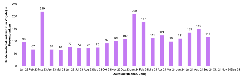 Die Handelsaktivität basiert auf dem Handelsvolumen und lässt unmittelbare Rückschlüsse auf den aktuellen Jahrestrend im Handel mit ETFs bei Kunden der FNZ Bank zu. Ein Wert von über 100 steht für eine überdurchschnittliche Handelsaktivität der Kunden im Vergleich zum mittleren monatlichen Handelsvolumen des Vorjahres; ein Stand unter 100 zeigt eine unterdurchschnittliche Handelsaktivität an.